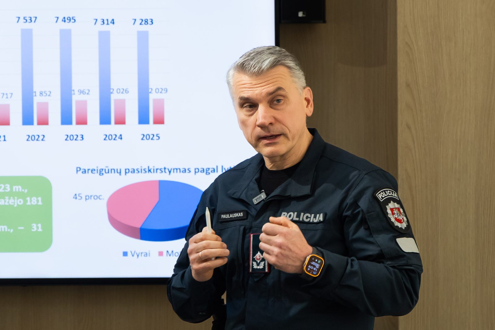Policininkų skaičiuose toliau mažėja. „Metus pabaigėme 31 policijos pareigūnu mažiau negu juos pradėjome“, – sakė A. Paulauskas. Šiuo metu policijoje dirba 55 proc. vyrų ir 45 proc. moterų.