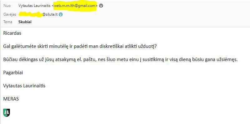 Pastaruoju metu fiksuojami atvejai, kai gyventojai gauna suklastotus laiškus neva nuo mero. Tai – sukčių bandymai apgauti ir pasinaudoti žmonių patiklumu.